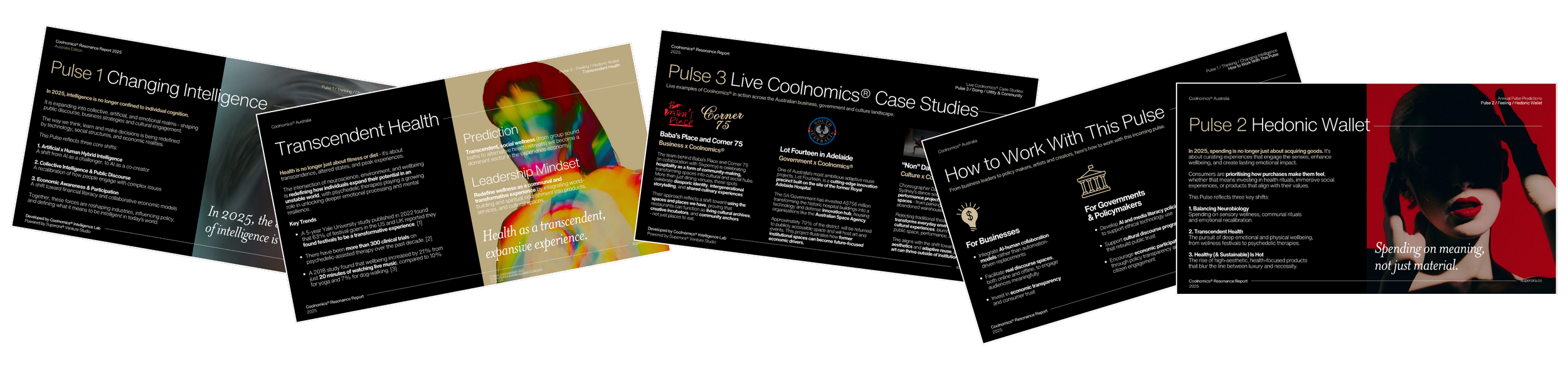 The Coolnomics® Resonance Report 2025 is an annual exploration of the cultural and economic forces shaping Australia’s industries, policies, and markets. This report is not about passing trends - it’s about resonance. It maps the shifts in values, intelligence, and consumer behaviour that define what lasts, what influences, and what drives the future.